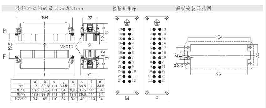尺寸:24 B,触点:24,导线截面积:0.75 ...2.5mm²,铜合金,镀银